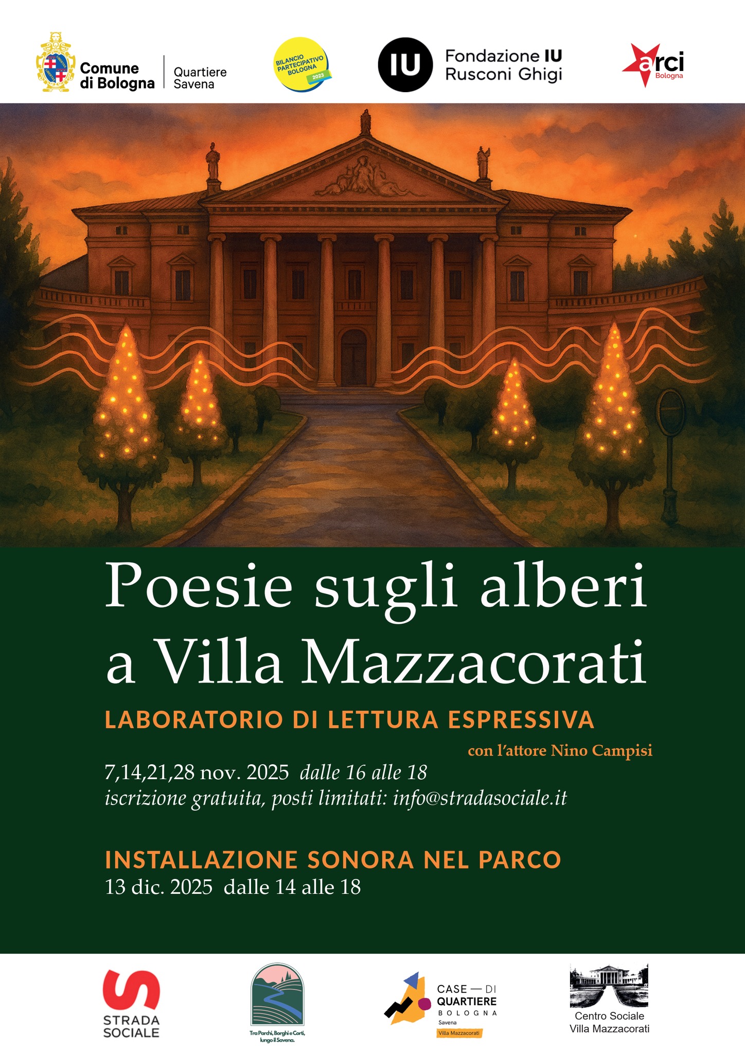 Sono aperte le iscrizioni al laboratorio di lettura espressiva “Poesie sugli alberi a Villa Mazzacorati” che si svolgerà in quattro pomeriggi (tutti i venerdì di novembre), dalle 16 alle 18, presso la Casa di Quartiere di Villa Mazzacorati in via Toscana 19, Bologna. La partecipazione al laboratorio è gratuita.